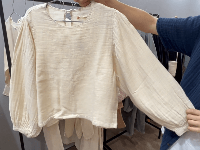 空気をふんわり含むスラブ糸で織り上げた蚊帳生地を使用した新作のトップスは、ボリュームのある袖がさりげなくかわいらしい印象をもたらしてくれる、甘さを抑えた大人のパフスリーブになっています。コンパクトな丈感なので、どんなボトムスとも合わせやすい形です。優しい色あいの「ピンク」はほんのり血色を与えてくれるような、取り入れやすい魅力的なカラーです。